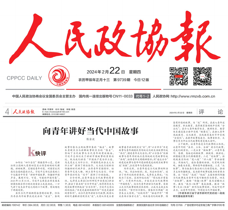 马克思主义学院陈金波教授在《人民政协报》评论版发表署名文章《向青年讲好当代中国故事》。作为宁波新时代党的统一战线研究基地首席专家,陈金波致力于统战理论创新成果研究,其研究成果《从绘制到开制:党的统战工作历史演进及现实启迪》《“三维”同构“四力”并举提升沿海城市青年人才“磁吸力”:以宁波为例》分别荣获2023年度浙江省统战理论创新成果三等奖、宁波市统战理论创新成果二等奖。