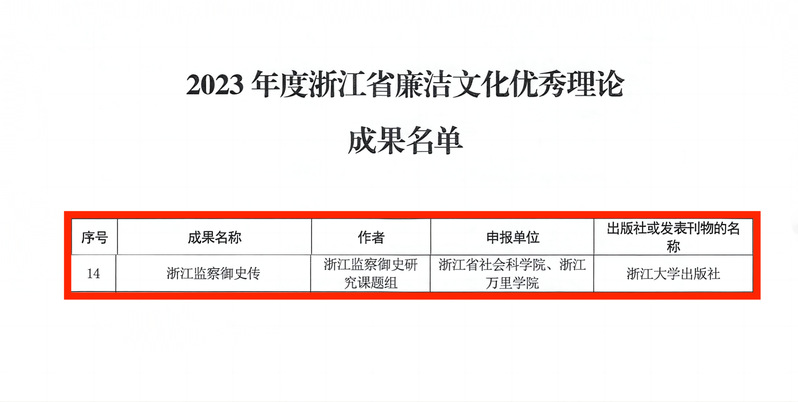 近日,省纪委省监委、省委宣传部、省社科联联合公布2023年度浙江省廉洁文化优秀理论成果获奖名单, 浙江万里学院与浙江省社科院联合申报,马克思主义学院教授陈金波为共同作者的《浙江监察御史传》被评为2023年度浙江省廉洁文化优秀理论成果。