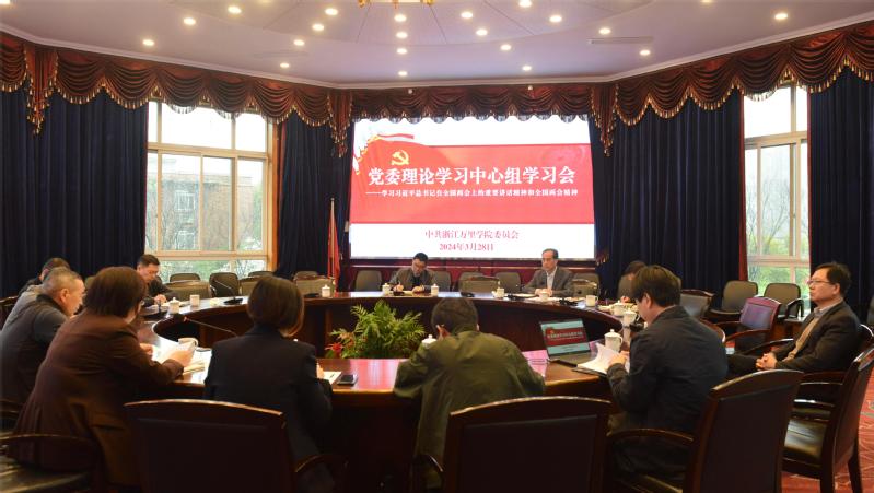 3月28日上午,学校党委理论学习中心组在行政楼202会议室召开专题学习会,深入学习贯彻2024年全国两会精神,重点传达习近平总书记在全国两会期间发表的一系列重要讲话精神。党委理论学习中心组成员结合工作实际,就精神落实、任务聚焦、措施深化等方面进行交流发言。党委书记蒋建军主持会议。