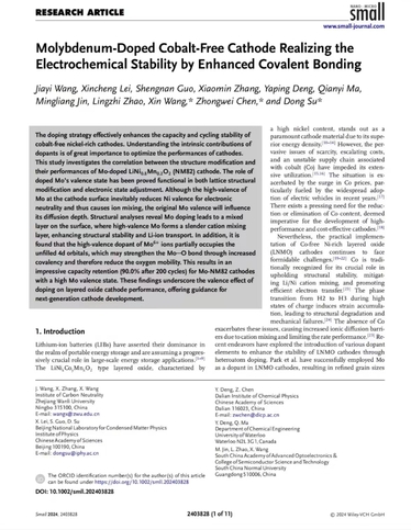 “Molybdenum-DopedCobalt-Free Cathode Realizing the Electrochemical Stability by Enhanced Covalent Bonding(钼掺杂诱导共价强化提升无钴高镍层状正极材料循环稳定性)”,论文通讯作者陈忠伟、王新和中科院物理研究所研究员苏东,第一作者为王加义。据悉,这是我校首次以第一完成单位在Advanced Energy Materials与Small期刊发表研究成果。