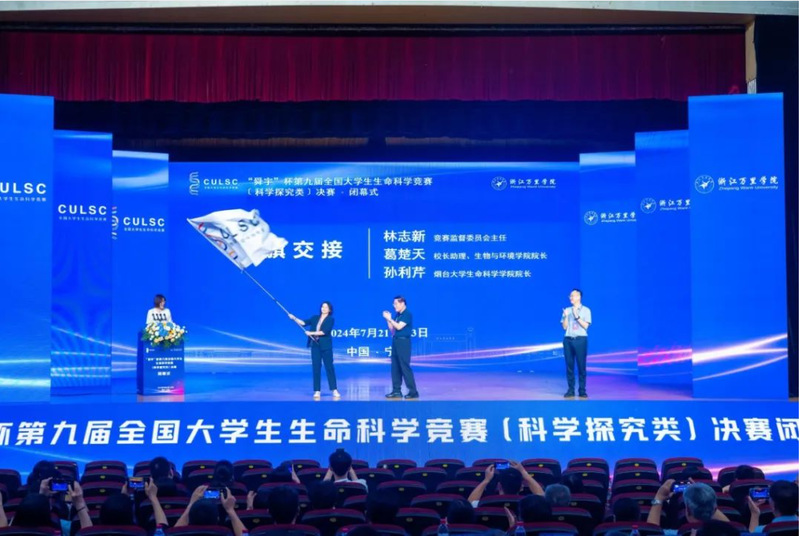 闭幕式上举行了赛旗交接仪式。浙江万里学院将赛旗交接给第十届竞赛承办单位烟台大学,下一届竞赛决赛将于2025年7月在烟台举行。随着赛旗交接仪式的完成,历时三天的“舜宇”杯第九届全国生命科学竞赛决赛大会圆满落下帷幕。