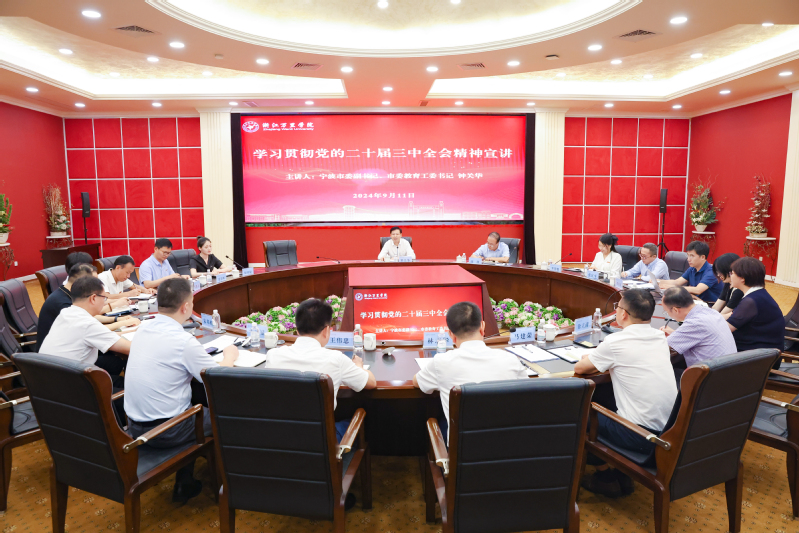 9月11日,宁波市委副书记、市委教育工委书记钟关华来校宣讲党的二十届三中全会精神,进一步推动全会精神落实落细、见行见效。宁波市教育局党委委员、副局长陈欣,学校领导班子成员出席,各部门负责人、各学院院长、书记,师生代表等参加会议。宣讲会由党委书记王伟忠主持。