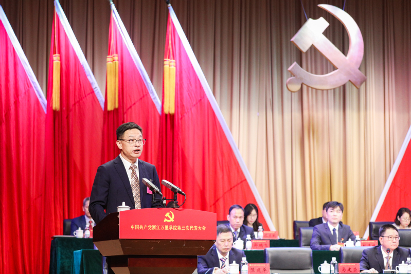 中国共产党浙江万里学院第三次代表大会,是在我国全面建设社会主义现代化国家迈入新征程、我省持续推动“八八战略”走深走实、我校全力推进高水平应用型大学建设、聚力攻坚升格大学和成为博士学位授予单位的关键时期,召开的一次十分重要的会议。大会的主题是:高举习近平新时代中国特色社会主义思想伟大旗帜,全面学习贯彻党的二十大和二十届二中、三中全会精神,以及省委、市委全会精神,全面贯彻党的教育方针,在中国式现代化进程中奋勇担当教育强国、高教强省的万里使命,体制机制再创新,聚力改革再跨越,深入实施内涵式特色化的高质量发展战略,为全面建设国内一流、国际知名的高水平应用型大学而团结奋斗。