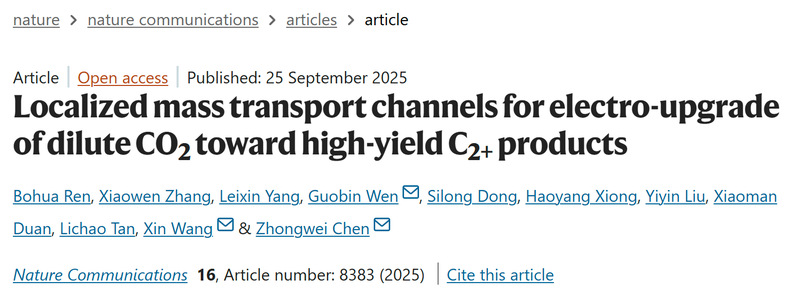 国际综合性顶级期刊Nature Communications(2024 年影响因子15.7)近期迎来重要研究成果——浙江万里学院碳中和研究院以第一单位合作发表重磅论文“Localized mass transport channels for electro-upgrade of dilute CO₂ toward high yield C2+ products”(局部传质通道助力稀释CO₂电催化升级,实现高产率C2+产物),陈忠伟、王新、文国斌为该论文通讯作者。该论文的发表标志着学校在碳中和领域关键技术研究上取得突破性进展,顶刊成果再添新彩。