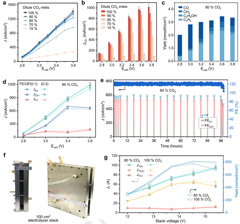 针对上述难题,浙江万里学院碳中和研究院团队提出了一种通过构建局部质量传输通道来实现稀释CO₂高效转化的方法。通过在单原子掺杂的Cu2O(In₁@Cu2O)上构建COF(共价有机框架)层,实现了CO2的集中和转化过程的耦合。其中,三氟甲基功能化的COF(TfCOF)发挥了至关重要的作用,它作为局部通道,极大地促进了CO2/CO的局部质量传输。与此同时,In1@Cu2O能够增强对*COOH的吸附,为C2+产物的生成提供了更有利的条件。通过这一创新设计,研究团队成功实现了在工业相关条件下,将稀释的CO2高效转化为高附加值的C2+产物。
