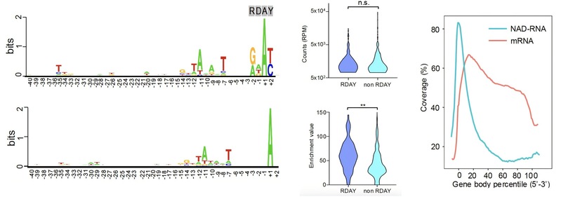 高分辨率图谱不仅鉴定出大肠杆菌中新的NAD‑RNA种类(包括tRNA、rRNA及反义RNA),更在TSS邻近区域(−2至+2)发现保守序列RDAY,统计发现带此序列的启动子通常产生较高NAD⁺加帽比例的转录本,为理解NAD加帽的分子机制提供了新的线索(图2)。值得注意的是,在氮源限制胁迫下,NAD‑RNA表现出显著的TSS切换与替代启动子使用现象,揭示其在感知代谢应激并重塑转录起始中具有潜在作用。