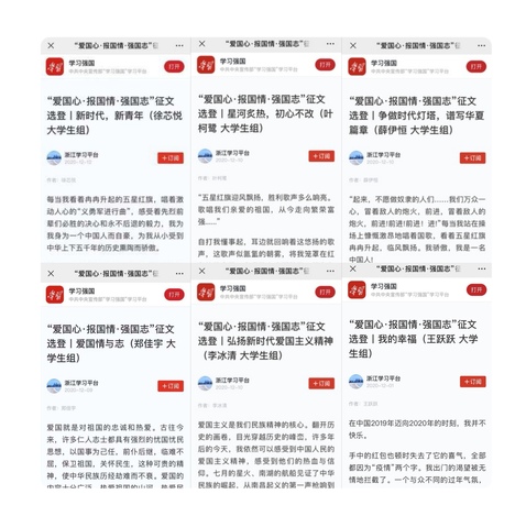 2020年8月初,“学习强国”浙江学习平台启动“爱国心·报国情·强国志”主题征文活动以来,共计收到投稿3801篇,“学习强国”选登文章849篇。活动开展以来,我校党委宣传部积极组织发动,二级学院高度重视,学生积极参与,共计投稿300余篇,其中被“学习强国”浙江平台选登48篇、全国平台选登4篇。同时,经过对学生作品的广泛收集,浙江万里学院官方微信公众号从中挑选优秀作品进行刊登。