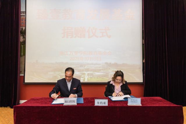 3月15日下午,臻壹教育发展基金捐赠仪式在行政楼112会议室举行。浙江臻壹文化传播有限公司向我校教育基金会捐赠25万元,主要用于建设培养电商直播人才的校园电商直播基地。