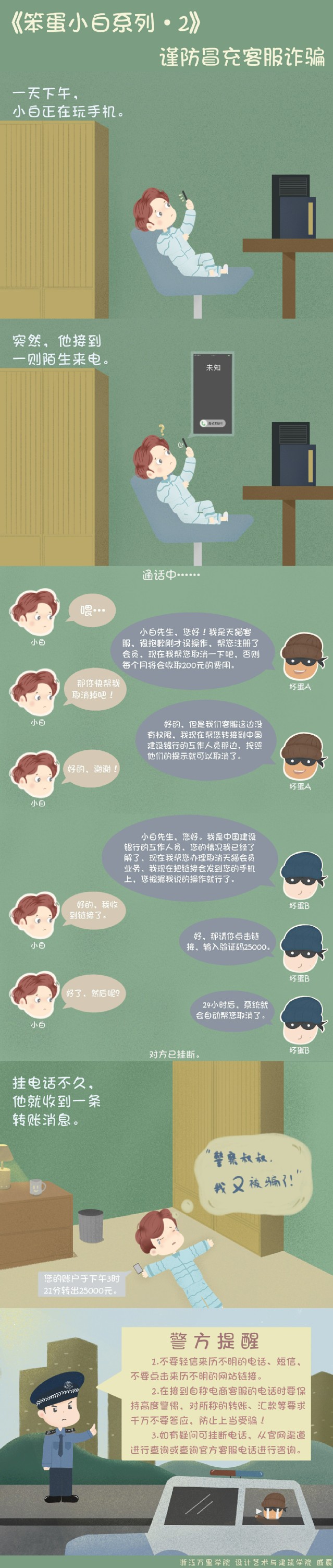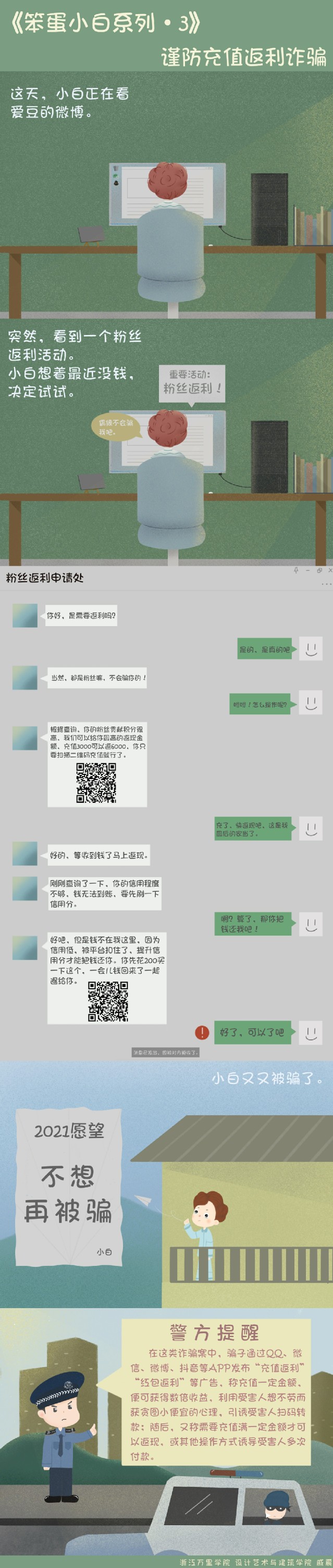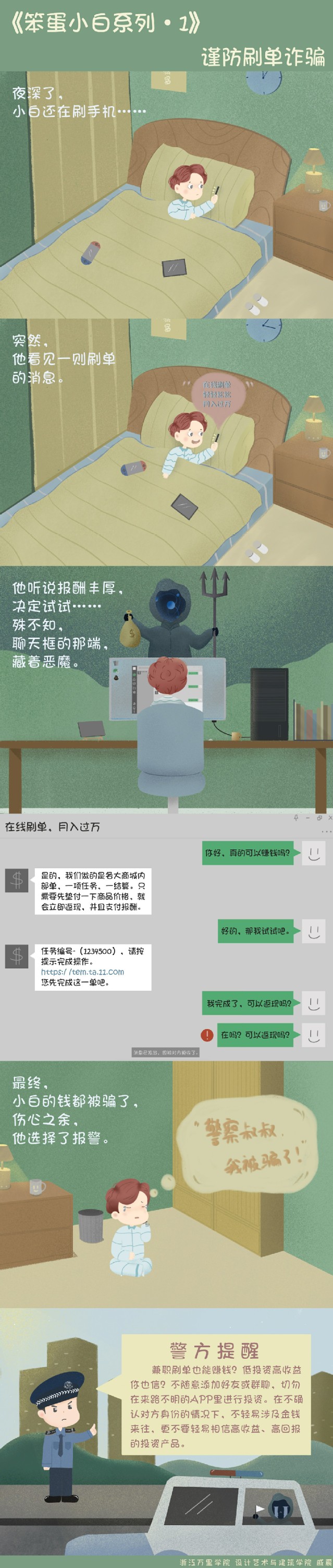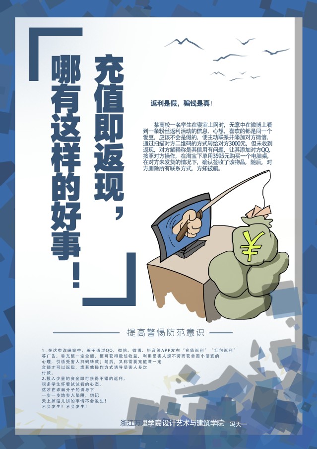 经过两周的作品征集,累计收到作品26件,经评选,共有5件作品获奖。作品包括反诈漫画与海报,让大学生在生动有趣、寓教于乐的氛围中了解常见诈骗形式,增强学生遭遇电信诈骗案件时的警惕性。