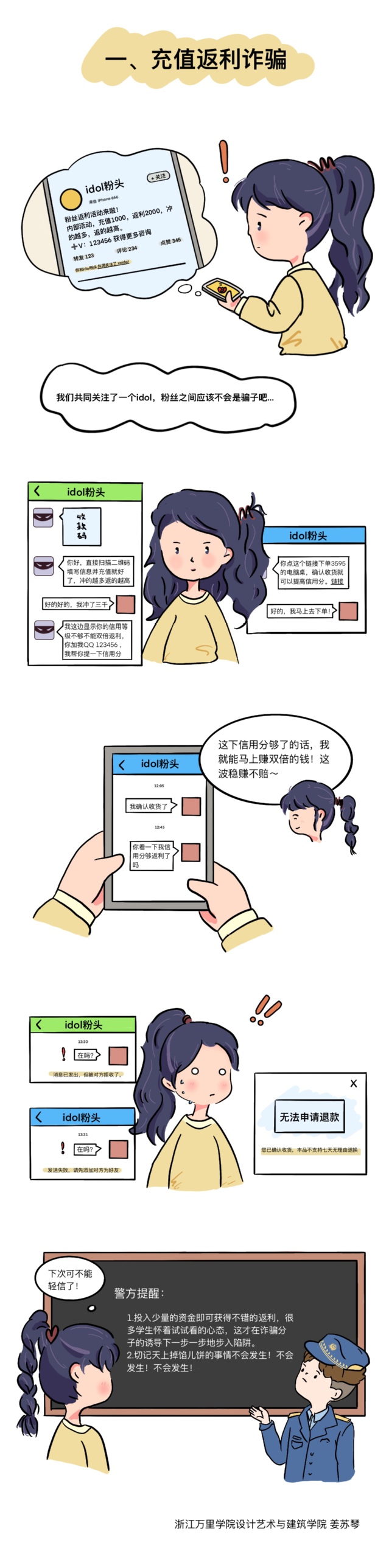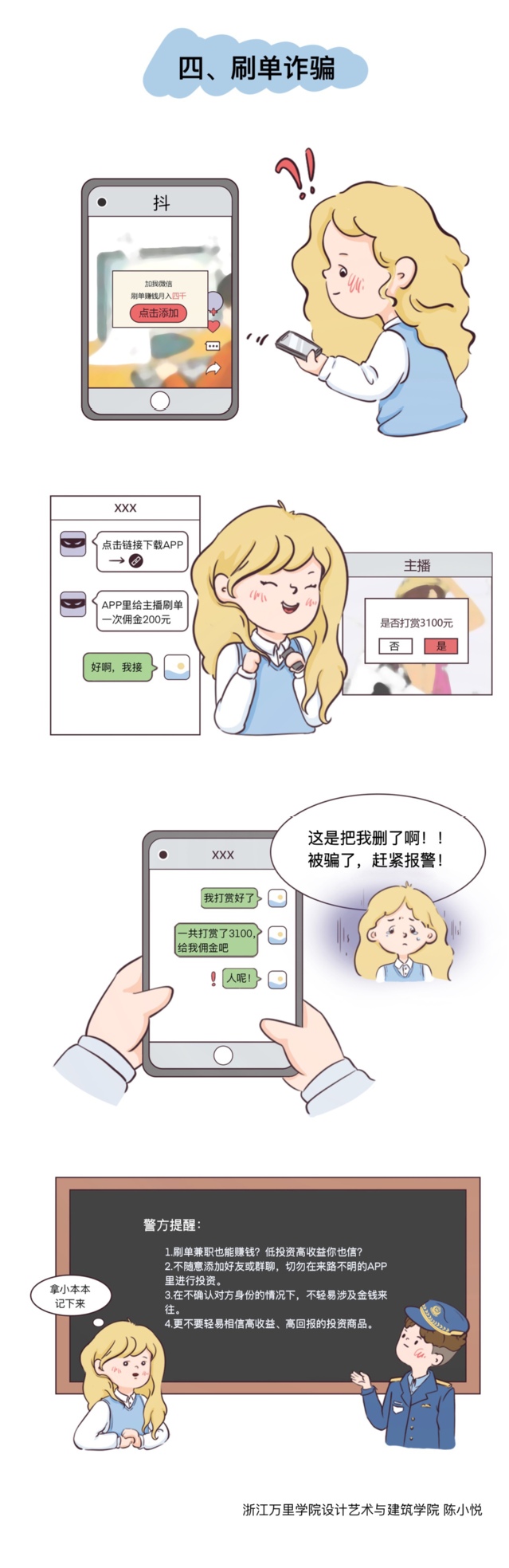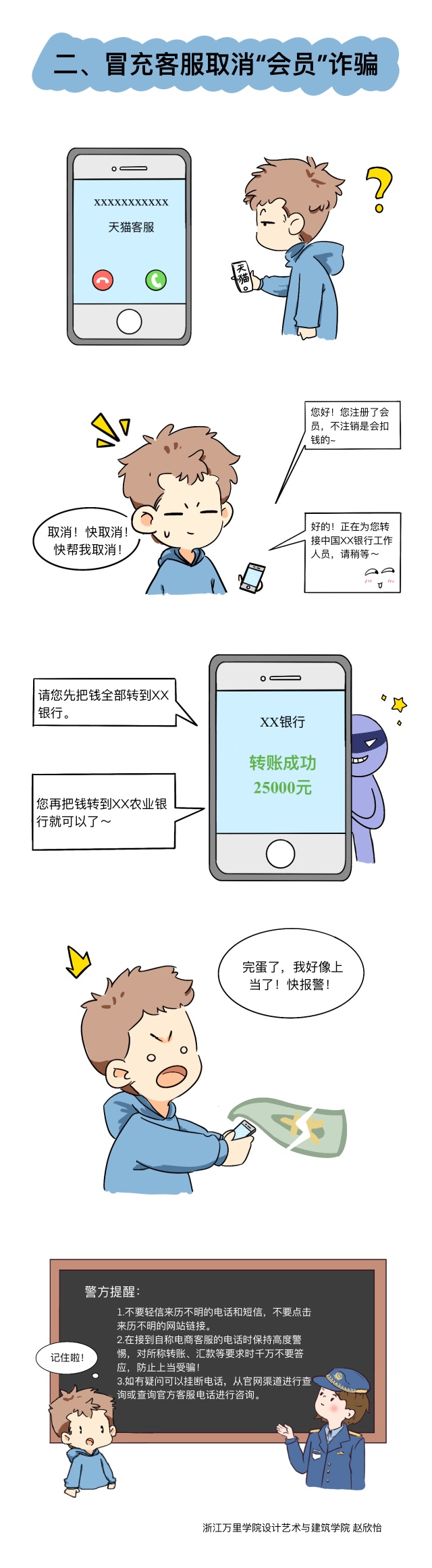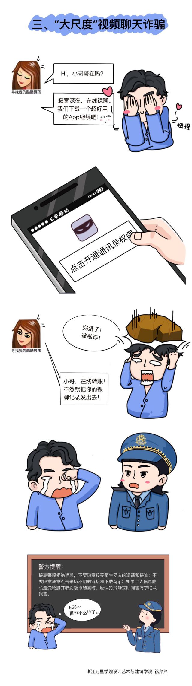 经过两周的作品征集,累计收到作品26件,经评选,共有5件作品获奖。作品包括反诈漫画与海报,让大学生在生动有趣、寓教于乐的氛围中了解常见诈骗形式,增强学生遭遇电信诈骗案件时的警惕性。