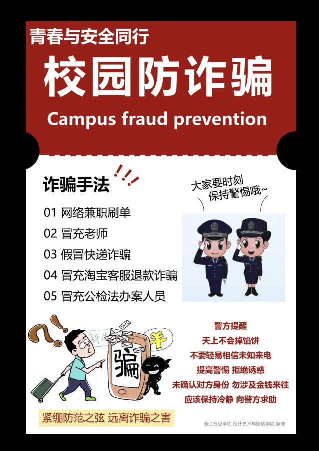 近日,文华派出所联合我校设计艺术与建筑学院和校园建设管理部(保卫部)开展“青春与安全同行,设计与创意助力”活动,让青年学生以笔助力防诈,共同推进“无诈校园”创建。