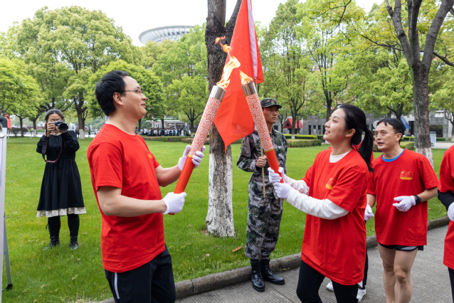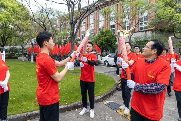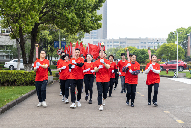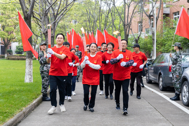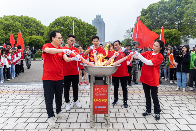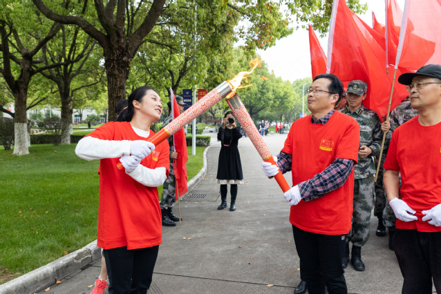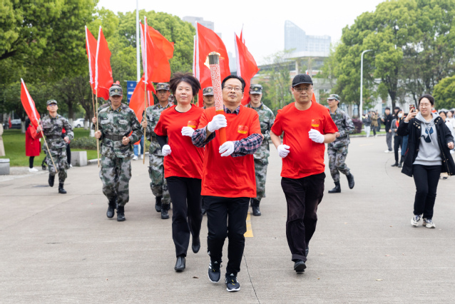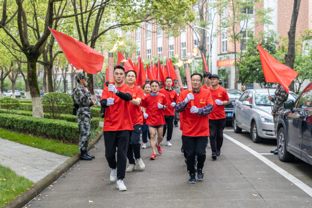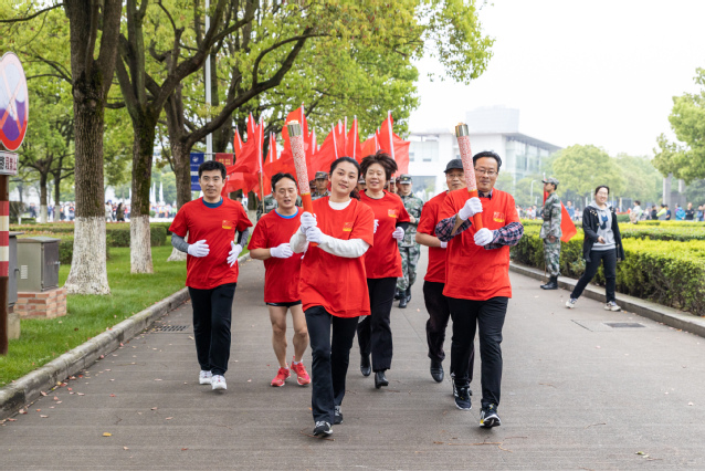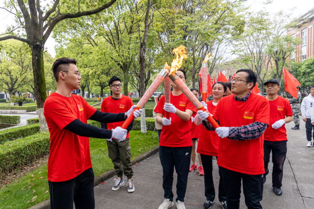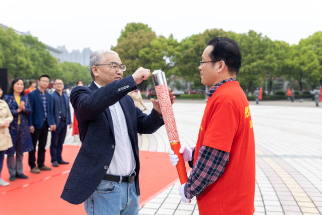 在雄壮的《红旗颂》乐曲中,应敏为第一棒火炬手点燃火炬。担任第一棒火炬手的是全国教育系统劳动模范、物流与电子商务学院教师鲁兴启,省师德先进个人、生物与环境学院教师戚向阳与市劳动模范、生物与环境学院教师汪财生担任护炬手。他们代表全校60年代教职工,从“党的一大”点出发,跑经“南昌起义”点,在“遵义会议”点时,点亮第二棒火炬手的火炬。