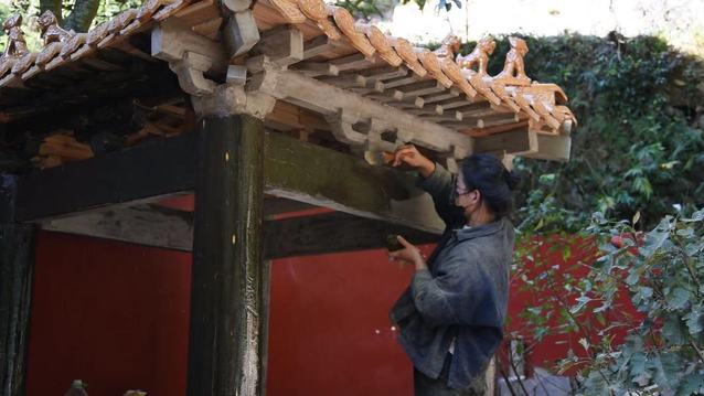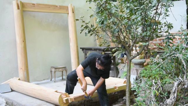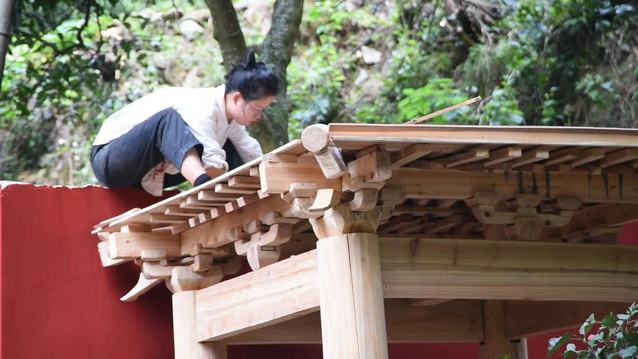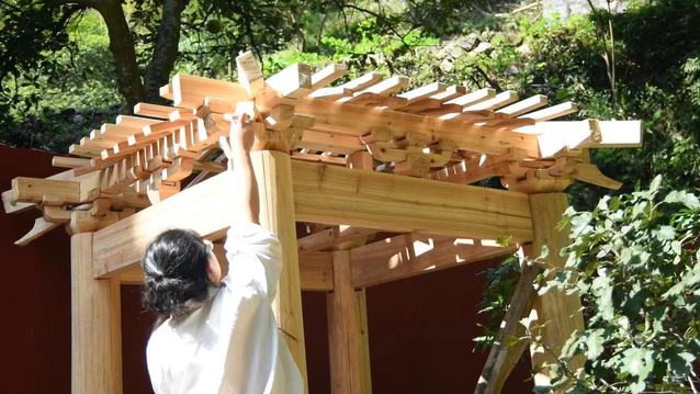 “拍视频的时候一直是一面红墙,拍久了有点单调。后来在网上看到故宫的一些亭子,它们相对简单,配色也好看,就决定在院子里做个亭子”,去年4月,没有任何建筑和设计经验的苏清吾立刻着手做了起来,自学榫卯、斗拱、彩画、地仗等技术。