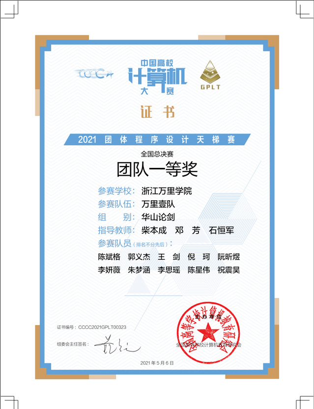 5月8日,从第六届“中国高校计算机大赛-团体程序设计天梯赛”组委会传来喜报,由我校大数据与软件工程学院柴本成、邓芳、石恒军老师指导的参赛学生表现优秀,取得优异成绩,我校的三支队伍总分5578分,在全国普通本科高校组252所高校中排名32,在浙江省普通本科高校组25所高校中排名第11,万里一队(陈斌格、郭义杰、王剑、倪珂、阮昕煜、李妍薇、朱梦涵、李思瑶、陈星伟、祝震昊)获全国团队一等奖;万里二队(南柳茹、周启鸿、易博、周仕杰、刘正永、李洋、王建圣、鲁雨婷、陈小语、余承昊)获全国团队三等奖;万里三队(蒋义凯、张峰豪、胡程翔、陈巧锦、张依琳、王景怡、沈文绒、汪洋、王佳杰、林俏斌)获浙江省团队三等奖。