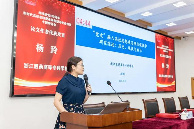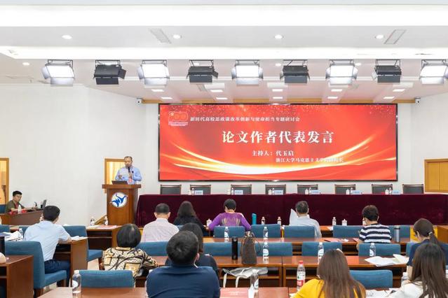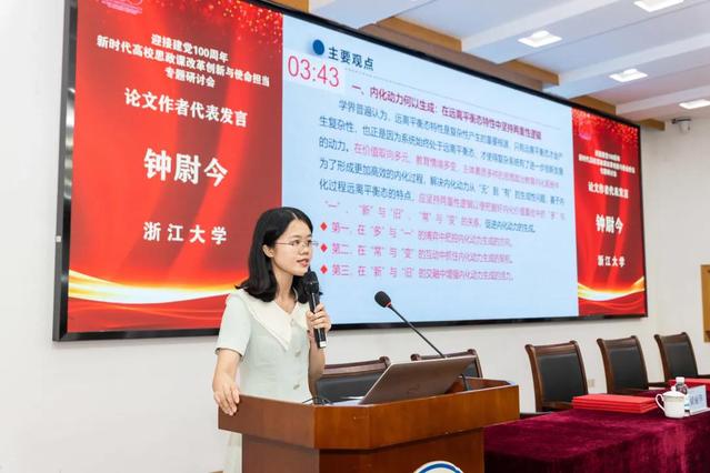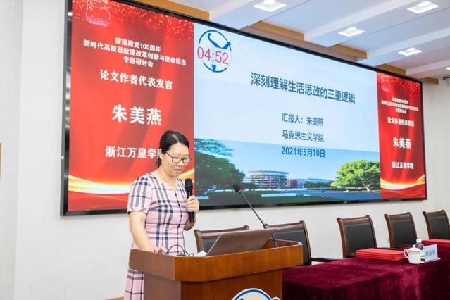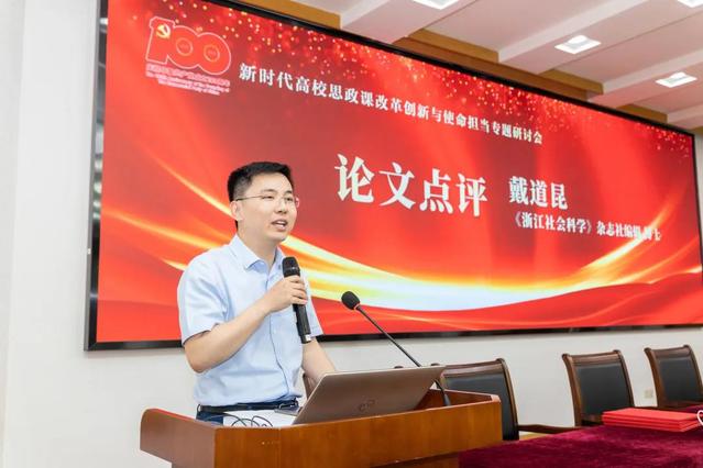 本次大会共收到来自全国高校师生的近百篇论文,由浙江省高校思想品德课程研究会进行评审。同时遴选了83篇论文汇编成册。浙江大学马克思主义学院副院长代玉启教授主持论文作者代表发言环节。我校朱美燕作名为“深刻理解生活思政的三重逻辑”论文分享;浙江医药高等专科学校杨玲作名为“‘党史’融入高校思想政治理论课教学研究综述:历史、现状与启示”论文分享;浙江艺术职业学院胡卓群作名为“新时代艺术院校思政理论课‘五为一体’审美化模式建构”论文分享;浙江大学钟尉今作名为“思想政治教育内化动力优化的关键点——基于复杂性思维视域”论文分享;中央民族大学魏美作名为“新时代党史学习教育与高校思政课教学改革深度融合”论文分享。《浙江社会科学》杂志社编辑戴道昆博士对现场分享的论文作了精彩点评。