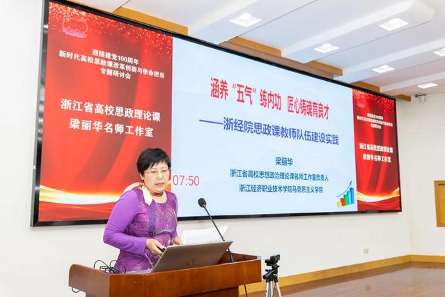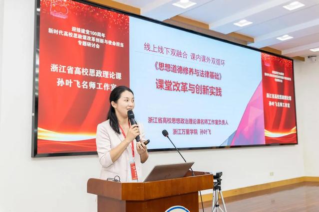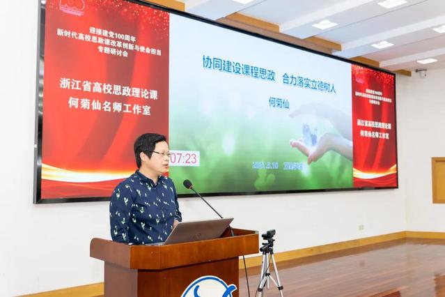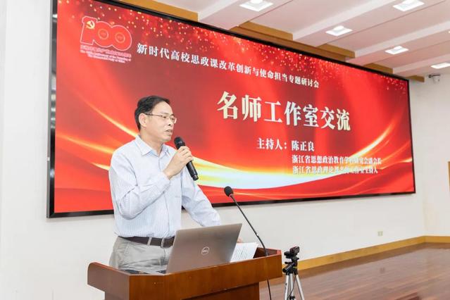 研讨会上,来自宁波大学的李包庚、杭州医学院的何菊仙、浙江经济职业技术学院的梁丽华、浙大宁波理工学院的伍醒、宁波财经学院的姜帆、宁波工程学院的张新光、浙江万里学院的孙叶飞等浙江省思政理论课名师工作室主持人作交流发言。这个阶段由浙江省马克思主义学会思想政治教育学科研究会副会长、宁波大学陈正良教授主持。李包庚围绕推动思政理论课高质量内涵式发展,提出要增强思政理论课教师的责任心和使命感,引培并举加强师资队伍建设,强化教学秩序管理。何菊仙以建设课程思政、落实立德树人为主要内容,分享了如何在课程知识应用的讲解中把价值引导的意义显现出来,让大学生在知情意行中找到课程思政的效果。梁丽华通过两支思政课综合实践视频,介绍了浙江经济职业技术学院思政教师团队在产教融合、理论研究、品牌育人和技能大赛等方面的建设实践。伍醒分享了学校思政课基于“三化三融”的“微系列”改革方案,以“微实践”“微宣讲”“微载体”等形式促进课堂和社会实践的融合。姜帆重点分享了大中小学思政课一体化建设在宁波本土的探索。基于思政教育共同体,思政学习共同体,思政学术共同体三方面的建设道路,大中小学思政课在实践中贡献了诸多别样的思政力量。张新光指出实践课应持续创新,在内容上挖掘地方文化特色;在模式上实施多平台、多形式创新;在队伍建设上形成协同机制特色,联动校内外资源。孙叶飞分享了我校“线上线下双融合、课内课外双循环”课堂改革与创新实践的探索经验,其名师工作室推出“朋辈领航”项目,由思政课导师全程带导,培养了一批学长讲师,融合生活思政精华讲述成长故事,为思政课堂注入新活力。