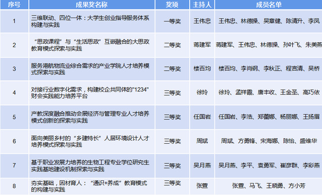 其中“三维联动、四位一体:大学生创业指导服务体系构建与实践”荣获一等奖,“‘思政课程’与‘生活思政’互嵌融合的大思政教育模式探索与实践”等2项成果荣获二等奖,“对接行业数字化需求,构建校企共同体的‘1234’财会实践能力培养平台”等5项成果荣获三等奖。获奖总数位居宁波本科高校第二位。