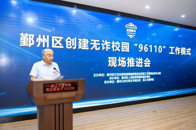 6月3日下午,鄞州区创建无诈校园“96110”工作模式现场推进会在我校召开,由我校联合鄞州区反诈专班、辖区文华派出所共同打造的无诈校园“96110”工作模式以万里学院为起点,将在鄞州区高校全面推广。鄞州区副区长、区反诈联席会议总召集人、公安分局局长陆朝晖出席并讲话,宁波市反诈联席办、宁波市教育局、宁波南高教园区各高校、鄞州区反诈联席会议部分成员单位、鄞州公安分局、首南街道等部门单位负责人参加。