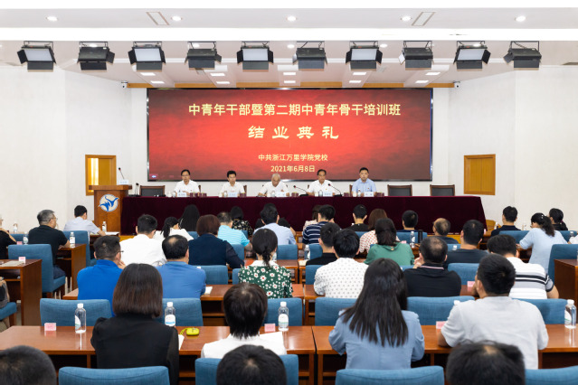 在结业典礼上,郑蕾娜、石巧珍作为中青年骨干培训班学员代表,袁勇军、朱仲杰作为中青年干部班学员代表上台交流发言,分享各自在培训班中学习锻炼后的体验和收获。朱仲杰作为学校推荐的参加在国家行政学院举办的第20期浙江高校中青年干部培训班学员,还向全体与会人员传达了自己的学习内容与体会。随后,与会领导为中青年干部和第二期中青年骨干培训班全体学员颁发结业证书并合影留念。