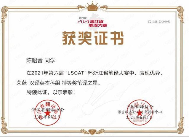 6月1日,第六届“LSCAT杯”浙江省笔译大赛落下帷幕,万里学子在本次比赛中“战绩”丰硕,其中来自外语学院19级英语专业的陈昭睿获得中译英的特等奖,被组委会冠以“笔译之星”称号,这也是浙江万里学院参赛四年来,首次获此殊荣。