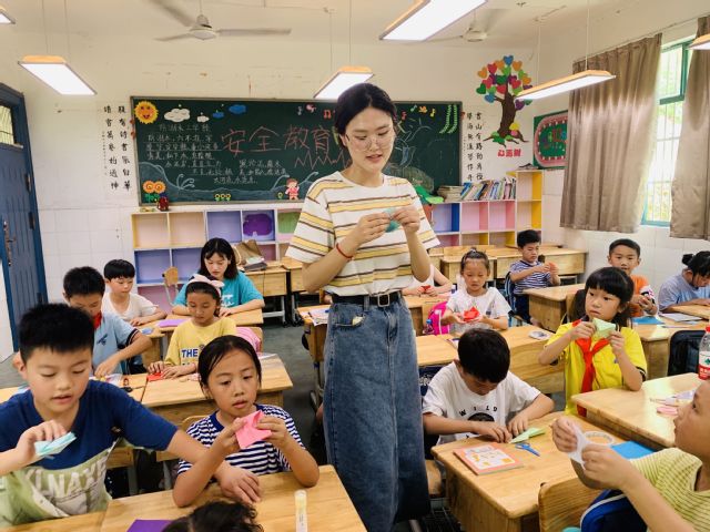 “本次暑期班共有197名来自附近乡村的小朋友,按年级将他们分配到9个班级中,针对性地设计了以外语课程为主体的教学体系,还增加了各类特色课程,包括书法入门体验课、自然揭秘小课堂、美育手工艺术课等。”韩颖介绍,实践队还将党史学习教育融入课程中,组织了以“党心耀童心,童心向党心”为主题的系列活动,新颖的教学方式让实践队成员和小朋友们都乐在其中。