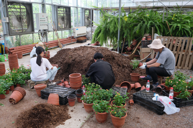 部分花苗在刚刚完成换盆后,出现了萎蔫、倒伏的情况,指导老师柳海宁告诉大家在花卉换盆后需要浇一次定植水,俗称“定根水”,将植株和盆土充分淋透,起到冲洗叶面和根部的作用,保证根部充分吸入水分。定植水能让翻盆后的花苗快速恢复生气、提高抗病力,对后期生长有极大的帮助。尽管酷暑难当,但是队员们干劲十足,配合默契,顺利完成500盆五色梅花苗的换盆工作。