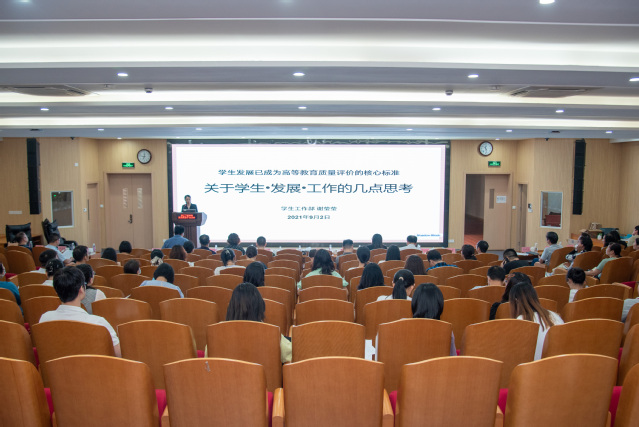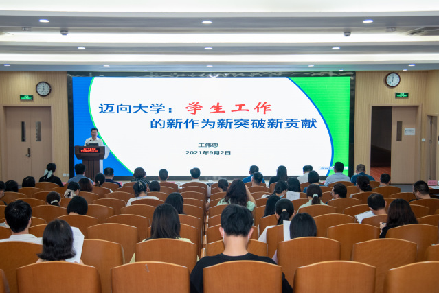 在学校进入高质量、跨越式发展的新阶段,在以学科建设为主线、以人才培养为中心、对标对表实现万里大学梦的发展新阶段,我校的学生工作为进一步顺应新阶段、把握新特征、对标新要求、作出新贡献,根据学校党委的统筹安排,9月2日召开了2021年学生工作大会暨辅导员培训会。党委书记蒋建军,党委副书记王伟忠,各学院分管学生工作书记、副书记,教务部、研工部、保卫部、后勤公司负责人,全体辅导员,学工部全体成员,后勤公司相关管理老师等参加会议。会议由学工部部长谢莹莹主持。