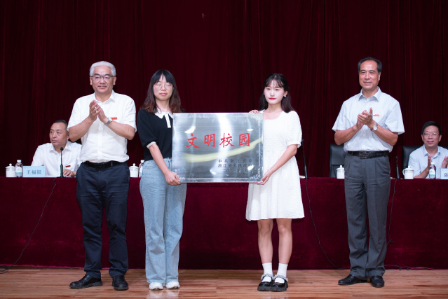在与会师生瞩目下,应敏和蒋建军共同为省级“文明校园”授牌,教师代表朱晓霞、学生代表侯丹丹接牌,象征群众性文明创建的进一步推进。