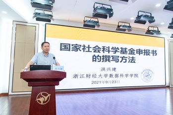 浙江财经大学数据科学学院院长洪兴建作“国家社会科学基金申报书的撰写方法”主题报告,从课题评审、选题方法、论证方法、研究基础等方面对国家社科基金项目申报进行了详细介绍和指导。