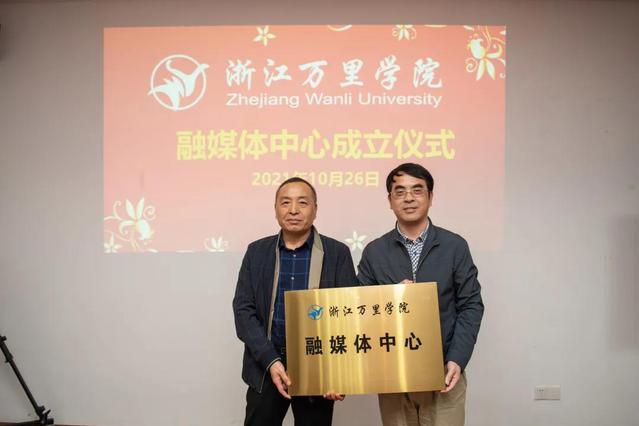 王福银为融媒体中心授牌,文化与传播学院院长陈志强接牌,这标志着融媒体中心正式落地成立。