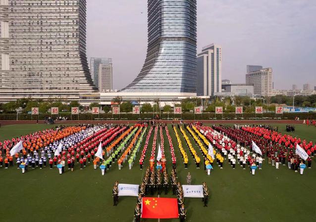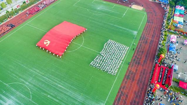 杜鑫航同学和冯极老师分别代表全体运动员和裁判员进行庄严宣誓,校长应敏宣布田径运动会的正式开幕。开幕式上,进行了武术、健身操舞蹈、阳光跑俱乐部教学成果展演,之后,由2000多名同学带来的精彩演出点燃了现场的激情。