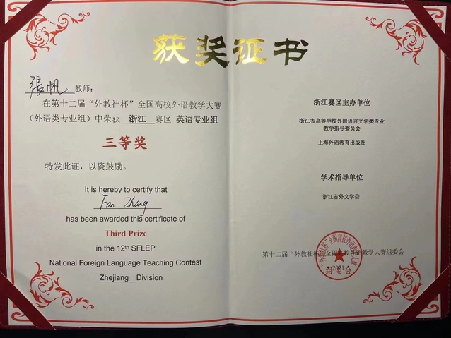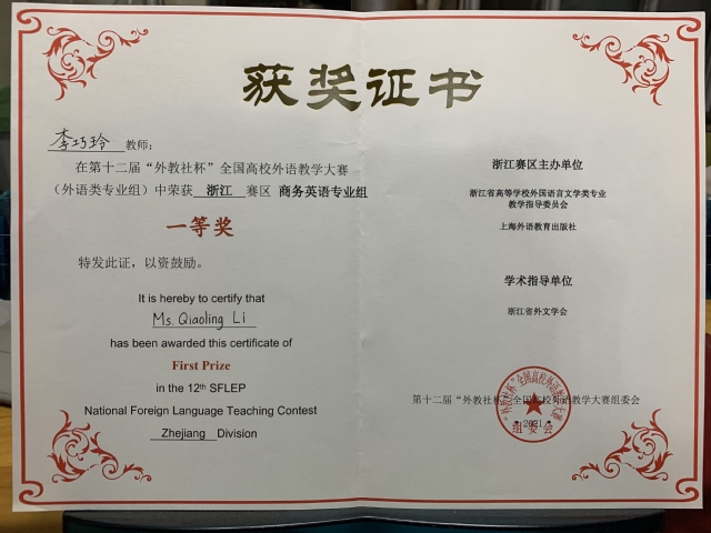 近日,由浙江外国语学院承办的第十二届“外教社杯”全国高校外语教学大赛浙江赛区比赛圆满落幕,我校外语学院商务英语系教师李巧玲获得商务英语专业组一等奖,英语系教师张帆获得英语专业组三等奖。