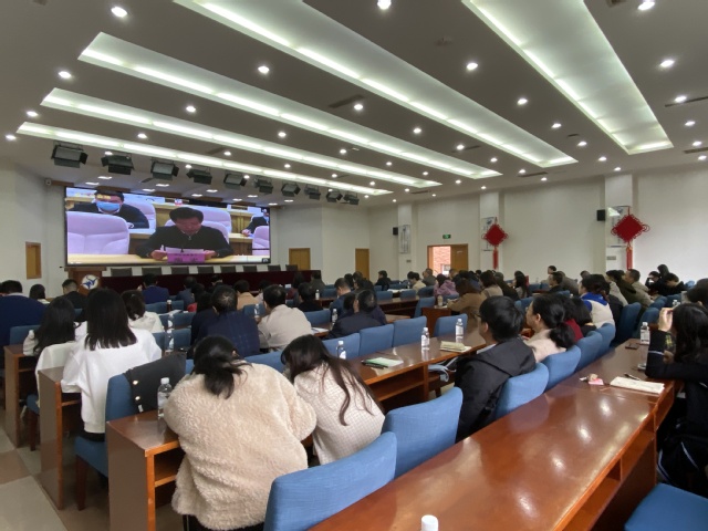 在我校分会场,党委书记蒋建军,学工部(就创中心)、研工部、教务部等职能部门负责人,各学院院长、分管就创工作领导、就业联络员及2022届全体毕业班班主任参加会议。