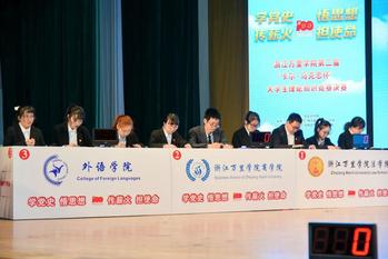 第二届“卡尔•马克思杯”大学生理论知识竞赛由党委宣传部主办,马克思主义学院、教务部、学工部(团委)承办,宁波广电集团宁聚新闻客户端提供技术支持。活动采取现场加直播的方式进行。