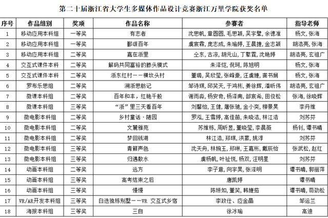 据悉,浙江省大学生多媒体作品设计竞赛是浙江省A类学科竞赛,由浙江省大学生科技竞赛委员会举办,旨在培养大学生计算机多媒体设计与制作水平和创新意识与能力,引导大学生有效应用多媒体技术服务社会。该竞赛迄今已举办二十届,近四年来,万里学子共获得一等奖13项、二等奖25项、三等奖40项。
