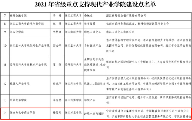 近日,浙江省教育厅公布了2021年省级重点支持现代产业学院建设点名单,我校物流与电子商务学院获批省级重点支持现代产业学院,这是继2016年获批宁波市首批试点特色学院后在产教融合领域取得的重要突破。