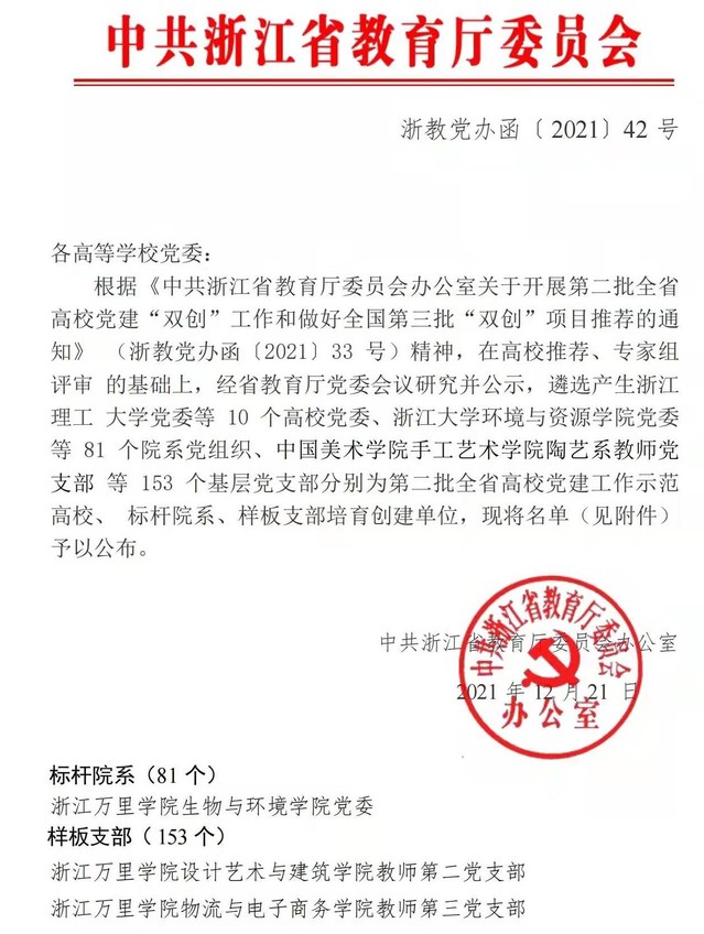 日前,中共浙江省教育厅委员会公布了第二批浙江省高校党建工作示范高校、标杆院系、样板支部培育创建单位名单,我校生物与环境学院党委获批高校党建工作标杆院系培育创建单位,设计艺术与建筑学院教师第二党支部、物流与电子商务学院教师第三党支部获批样板支部培育创建单位。