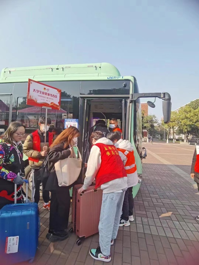 在志愿者的引导下,同学们按序上车,12:00整,第一班“万里专线”准时发车,中途不经停,40分钟左右就能到达宁波市火车站(汽车南站),大大缩短了出行时间。为配合节日气氛,学院特意为同学们准备了节日礼包,同学们笑着接过礼物,感受老师和志愿者们如家般的关怀和帮助。