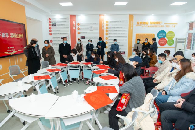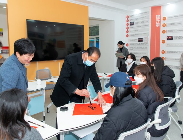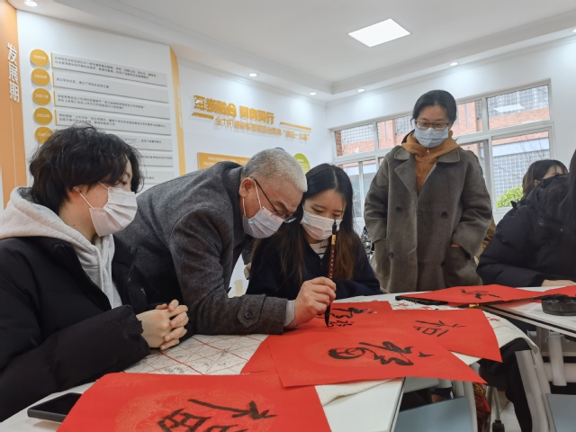 在生活思政驿站,留校的中外学生们正坐在一起写春联。应敏、蒋建军与学生们亲切交谈,和大家一起写“福”,并送上春节祝福。