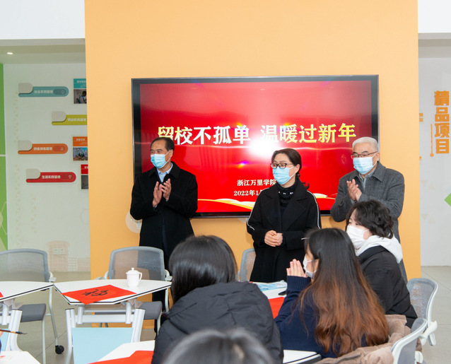 新春将至,岁寒情暖。带着对留校学生的关心和厚爱,1月26日,农历腊月二十四,南方人眼中的小年,宁波市教育局党委副书记徐文姬、教育局宣传与德育处处长余辉来到我校看望慰问留校学生,对节假日坚守工作岗位的教职工及留校过年学生送上节日的问候和新春祝福。校长应敏、党委书记蒋建军、党委副书记王伟忠陪同慰问。