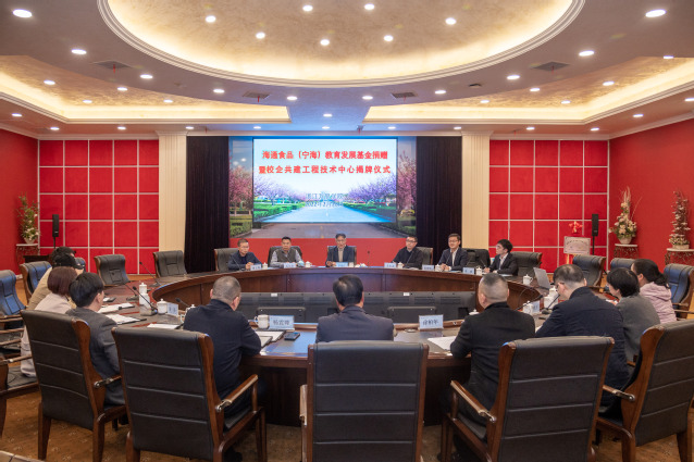 2月28日下午,我校举行海通食品(宁海)教育发展基金捐赠暨校企共建工程技术中心揭牌仪式。海通食品(宁海)有限公司董事长罗镇江、总经理王央苗等公司代表,我校党委书记、教育基金会理事长蒋建军,副校长杨震峰及相关部门负责人出席。