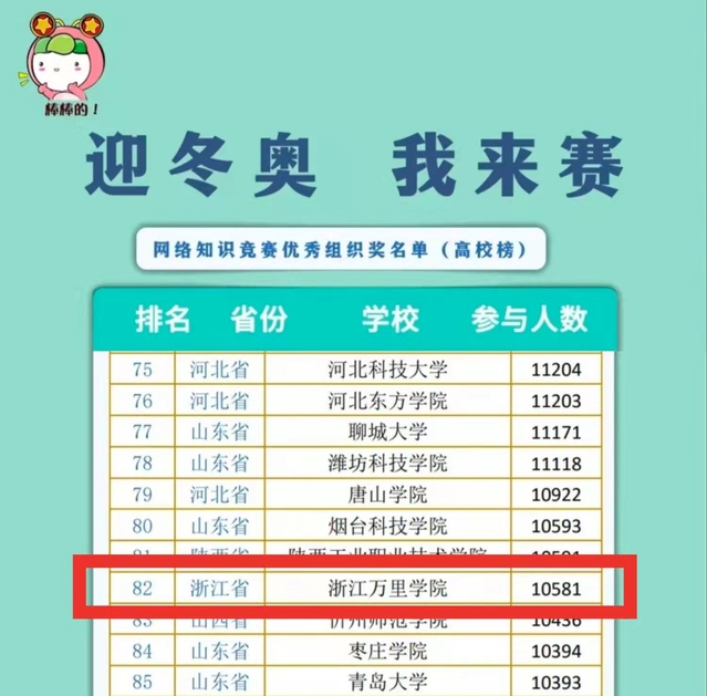 近日,由共青团中央青年发展部、国家体育总局群众体育司等联合推出的“迎冬奥,我来赛”网络知识竞赛活动落下帷幕,我校参与人数位居全国第82名、浙江省第4名,学校获优秀组织奖。