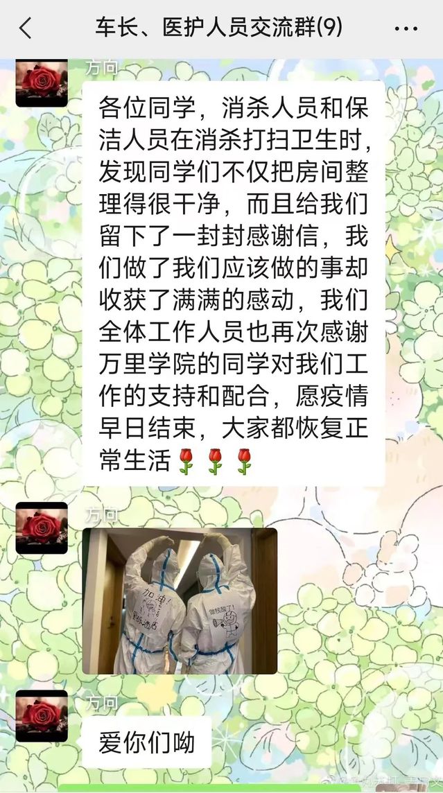 离开之前,感恩的心情萦绕在每一位同学的心头,姚璟表示:“学校一直教育我们要常怀感恩之心,在外也要展现出万里学子的文明风采。我们的能力有限,能做的只有将房间打扫干净,让这里的工作人员减轻一些负担,也是我对他们表达感谢的一种方式了。”同学们以这种方式对校外隔离生活画下句号。