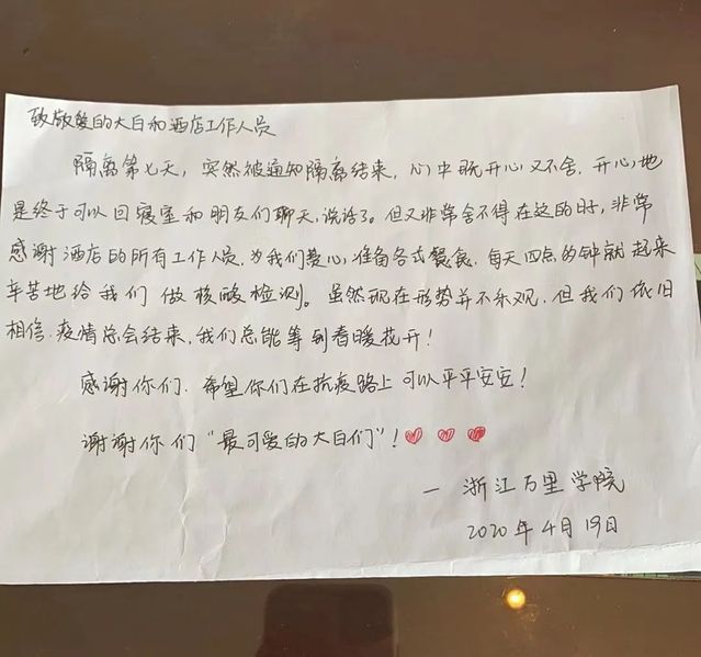 一位同学在写给隔离点的感谢信中讲到,刚住进酒店的时候自己有点情绪,“但你们仍然井然有序地进行着各项安排工作,不管是酒店还是工作人员都尽力地满足着我们生活上的需求,在情绪平稳下来之后想想,这么多天以来真的受到很多关爱,真的很感谢。”