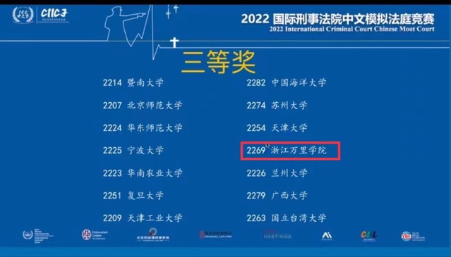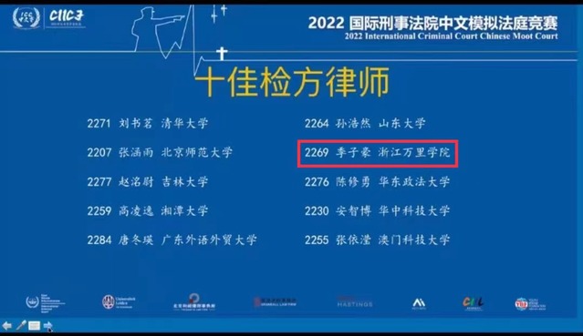 4月17日晚,国际刑事法院中文模拟法庭比赛成绩揭晓,我校法学院代表队荣获正赛综合“三等奖”,队员季子豪获“检方律师十佳辩手” 荣誉称号。