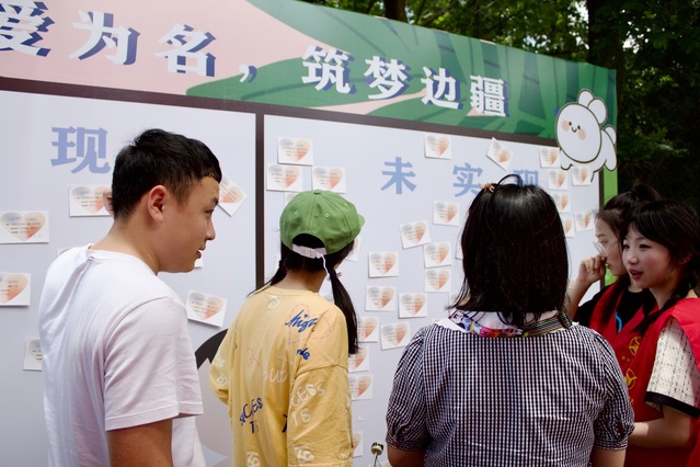 活动现场的心愿墙上,悬挂着一张张爱心卡片,上面是暑期社会实践队队员与新疆哈巴河县委宣传部工作人员联合收集的新疆哈巴河县孩子们的心愿。或许是一本《战争与和平》、一本《本草纲目》、一套四大名著、一本六年级作文书;或许是一套文具用品、一套彩笔、一个书包;或许是一副羽毛球拍、一个篮球、一个地球仪;又或许是一件校服、一双球鞋,孩子们的心愿就这样汇聚成了一面墙。