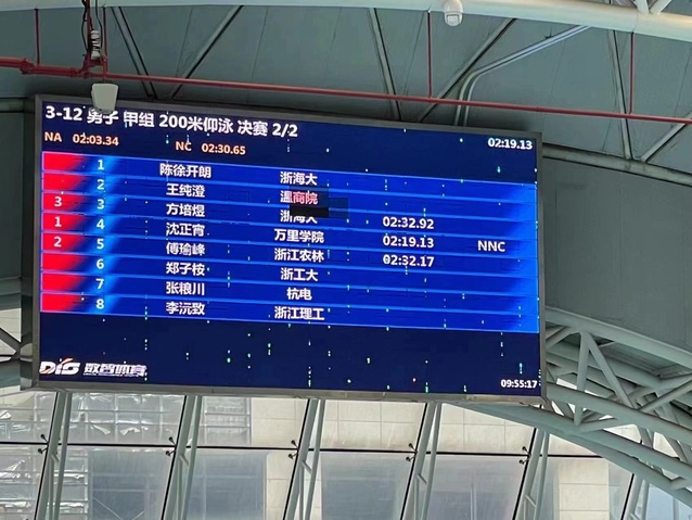 6月29日,在2022年浙江省大学生游泳锦标赛上,我校沈正宵个人2次夺冠、1次破纪录,他也是这次比赛中唯一破纪录的选手。学校游泳队斩获3金1银1铜获得男子团体总分第二、团体总分第六的好成绩。