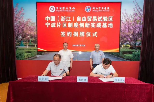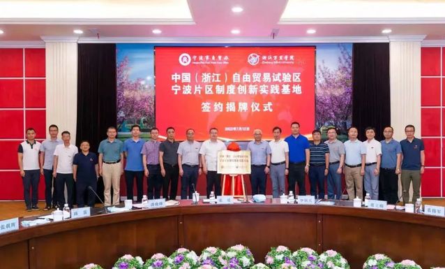 7月12日,我校与宁波市自贸办举行合作共建中国(浙江)自由贸易试验区宁波片区制度创新实践基地签约及揭牌仪式。市商务局党组书记、局长(市自贸办主任)、一级巡视员张延与我校校长应敏共同为宁波片区制度创新实践基地揭牌。市商务局党组成员、副局长(市自贸办副主任)华弼天与我校副校长杨震峰签署《战略合作协议》。
