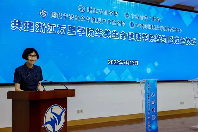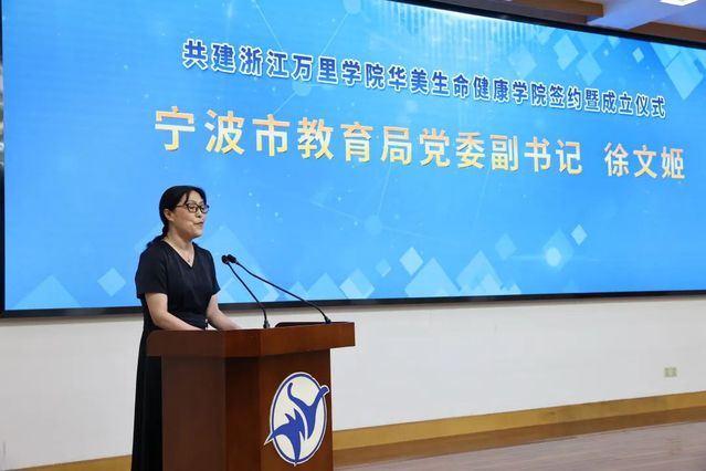 徐文姬代表市教育局对浙江万里学院华美生命健康学院的成立表示热烈祝贺,表示这是宁波市高等教育发展的一件喜事,也是宁波市卫生系统的一件大好事。徐文姬希望合作双方落实合作、拓展合作、深化合作,通过优势互补、取长补短,形成发展合力,推动学院学科建设与人才培养高质量发展,产出丰硕人才培养与研究成果,协同打造生命健康事业发展新高地,创造地方应用型高校+医院合作教育模式的新典范,为我市高等教育和健康产业的发展增添新色彩,谱写新篇章。