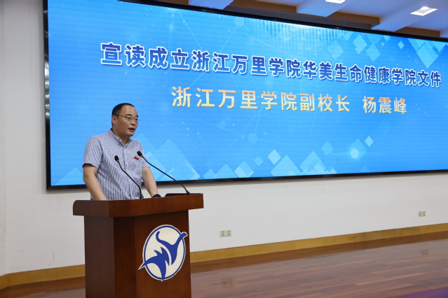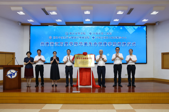 杨震峰宣读学校成立浙江万里学院华美生命健康学院文件,应敏与郑建军代表双方揭牌,徐文姬、周建霖、应雄、王波定、钱国英共同见证。